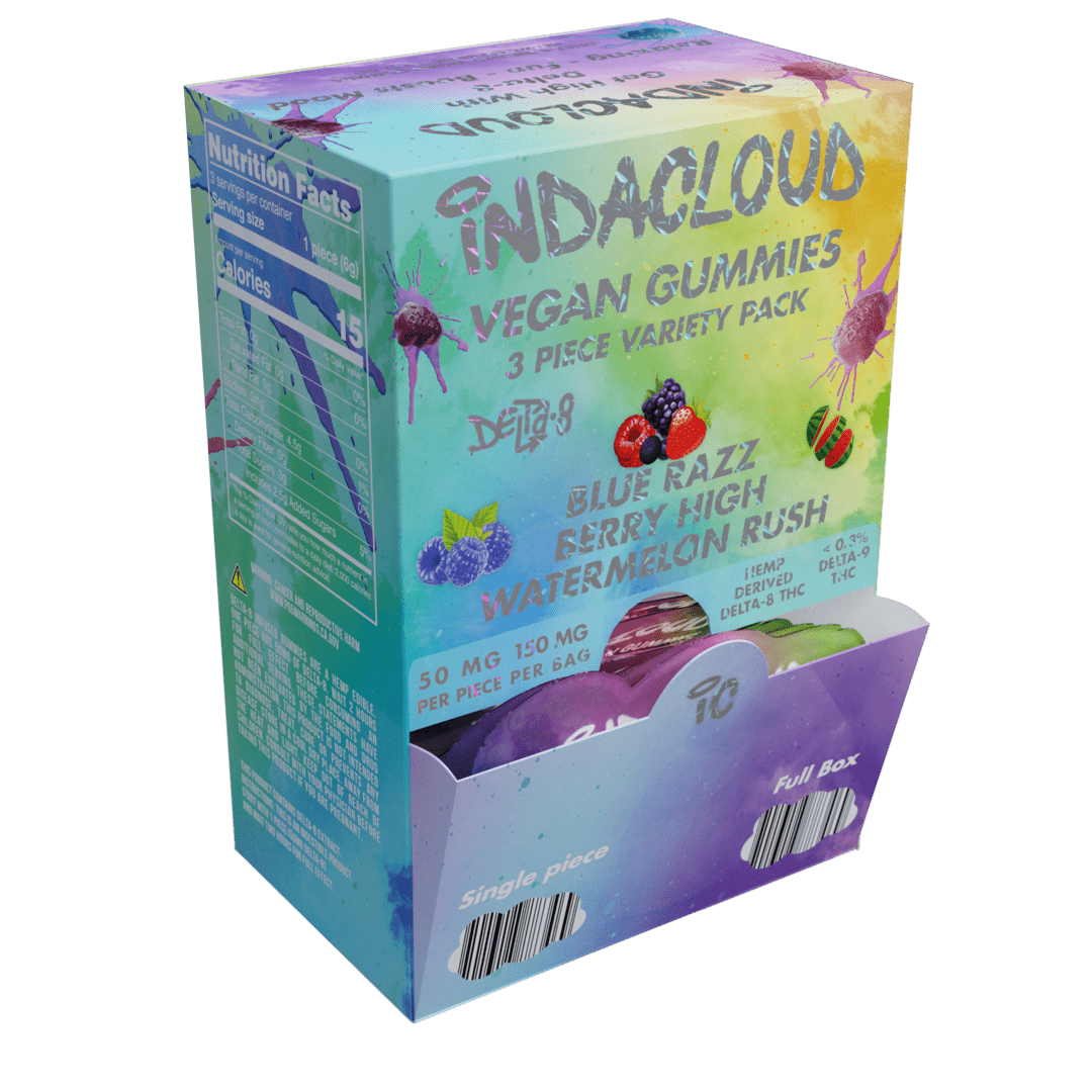 The Indacloud 3 Pack Variety D8 Gummies are a sample pack of each of our top selling D8 Gummy flavors. Each pack contains 1 Blue Razz 50mg gummy, 1 Watermelon Rush 50mg gummy, and 1 Berry High 50mg gummy. This sample pack is sure to pack a punch at 150mg per unit.