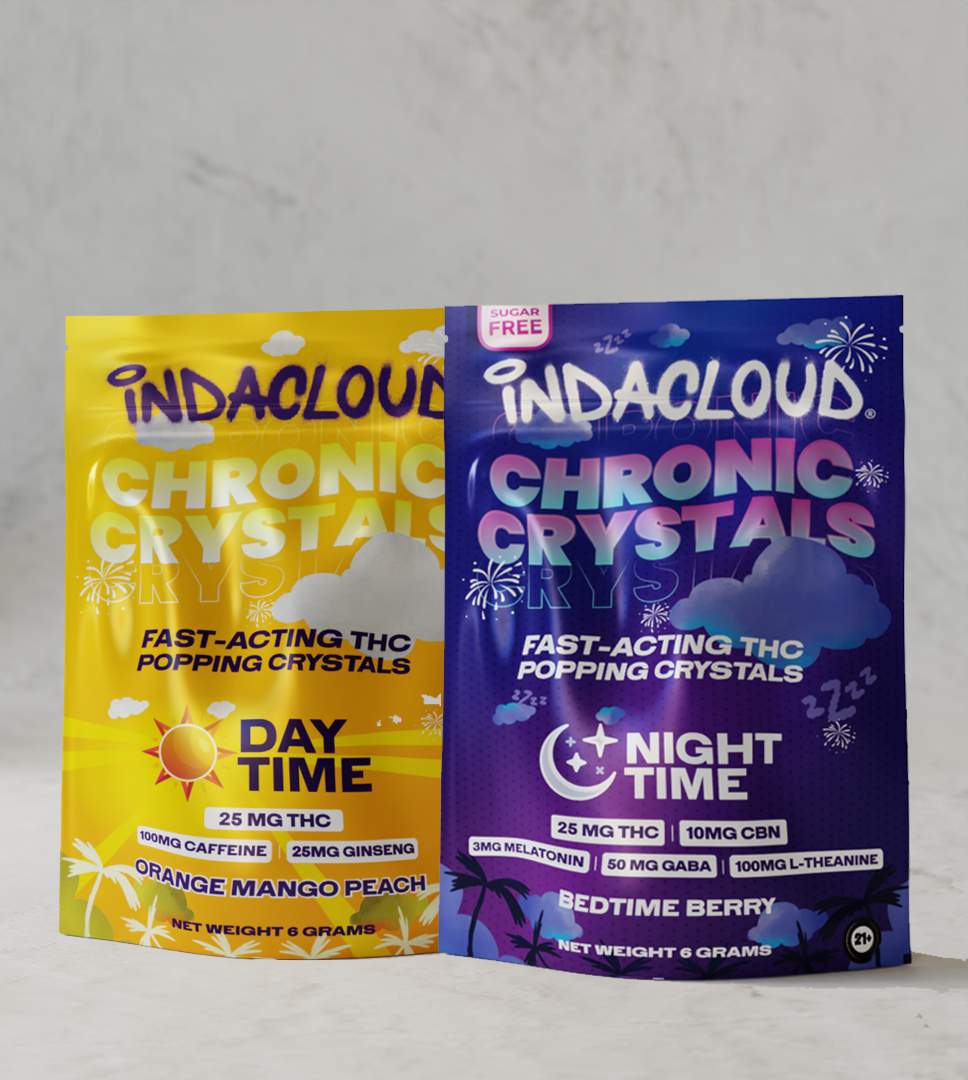 The Indacloud Day Time and Night Time Popping Crystals come in a display box with 30 units of Day Time and 30 units of Night Time popping Crystals. PM/Night Time: Bedtime Berry Description Say goodbye to restless nights and hello to almost instant sweet dreams with Nighttime Chronic Crystals. These deliciously fizzy, sugar-free popping crsytals are infused with 25mg of hemp-derived THC, 10mg of CBN, 3mg of melatonin, 50mg of GABA, and 100mg of L-theanine. The fast acting, calming blend, paired with a luscious mixed berry flavor, gently soothes your mind and body into a state of deep relaxation. Perfect for winding down after a long day or easing into bedtime, these berry-flavored Chronic Crystals are the fun, fizzy ticket to a peaceful night’s rest. AM/Day Time: Orange Mango Peach Description Ever wish your morning coffee could be as fun as it is energizing, and kick in under 10 minutes? Meet Daytime Rapid Release Chronic Crystals, the perfect way to kickstart your day with a burst of citrusy, tropical flavor. These fizzy, THC-infused popping crsytals combine 25mg of hemp-derived THC with 100mg of caffeine and 25mg of ginseng for a focused, uplifting experience that keeps you energized and ready to conquer anything. The refreshing orange, mango, and peach flavors will light up your taste buds while fueling your productivity. Wake up, pop in, and power through your day with Chronic Crystals!